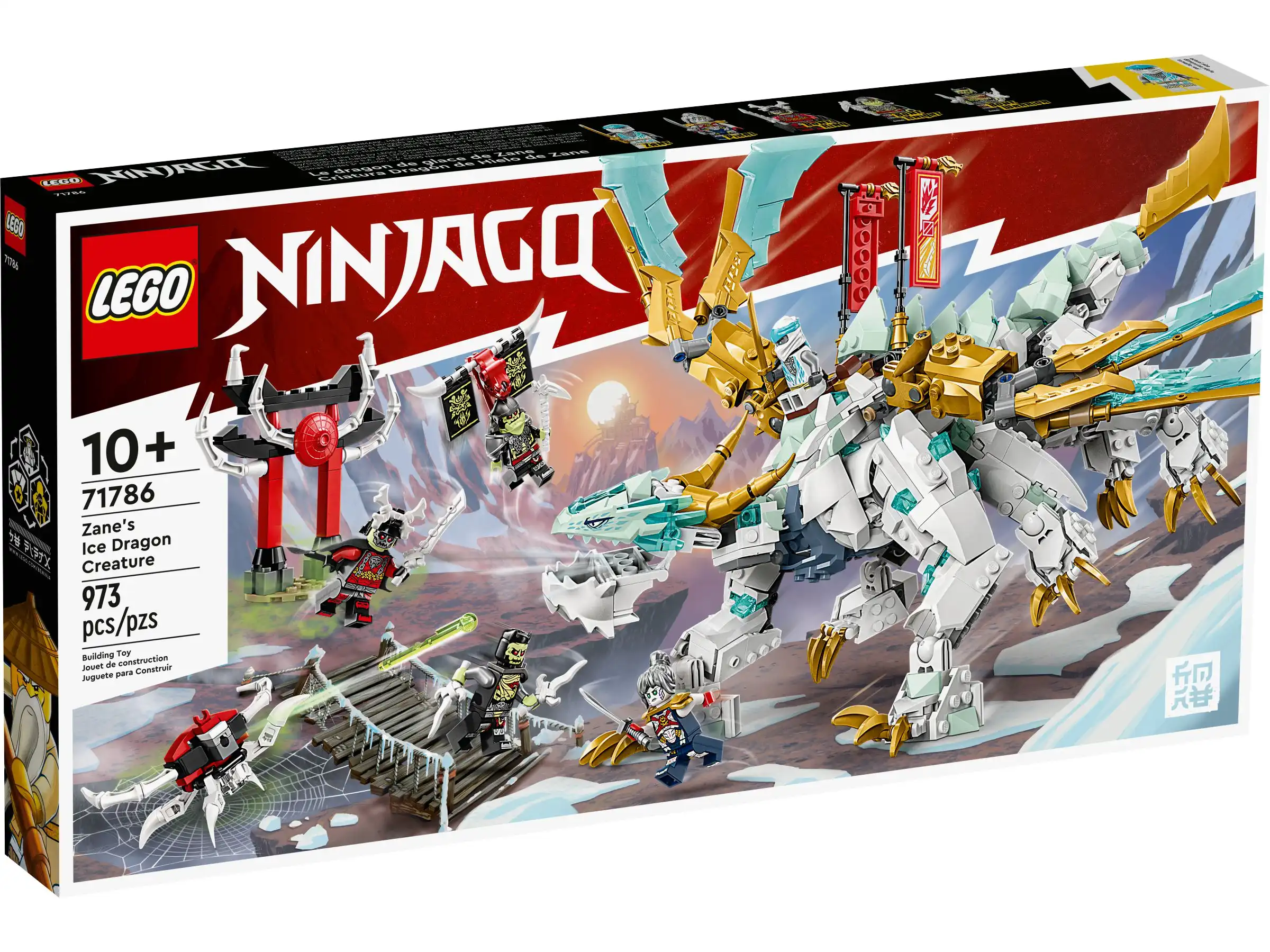 Zestaw LEGO® NINJAGO® Lodowy smok Zane’a (71786) zawiera wszystko, czego potrzebują dzieci w wieku od 10 lat do zabawy w odgrywanie ról z bohaterami ninja. Ten model NINJAGO 2 w 1 umożliwia stworzenie ruchomego lodowego smoka z sześcioma nogami, długim ogonem, rogami i skrzydłami ze złotymi ostrzami, a następnie przebudowanie go w ruchomego smoczego wojownika stojącego na dwóch nogach i trzymającego duże złote ostrze.