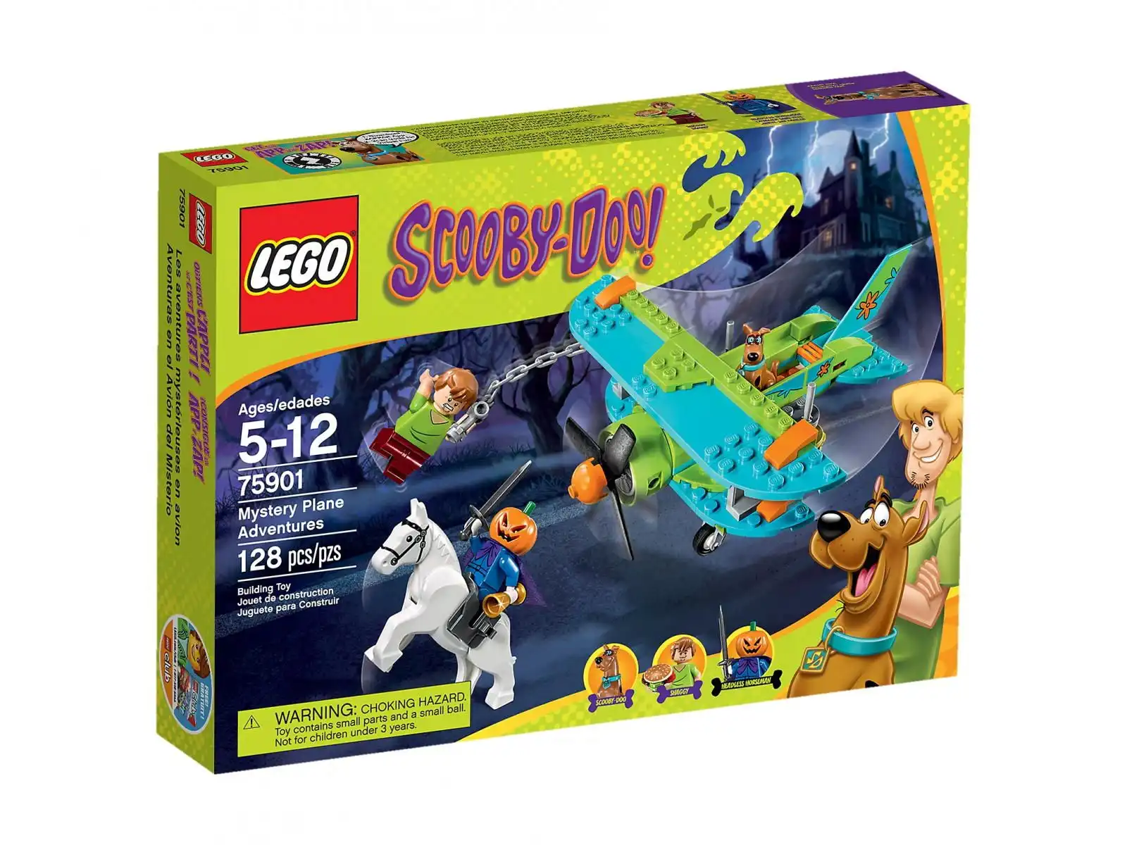 Dogoń bezgłowego jeźdźca z Kudłatym i Scooby-Doo i odzyskaj skradziony złoty puchar! Poszukaj wskazówek i wystartuj samolotem. Ale czy Kudłaty umie pilotować samolot? Już za późno, aby się nad tym zastanawiać! Zostaw Scooby'iego w kokpicie i każ Kudłatemu zawisnąć na łańcuchu i schwycić cenny puchar. Strzelaj hamburgerami w jeźdźca bez głowy, aby zrzucić go z konia. Potem zedrzyj złoczyńcom dynię z głowy i ujawnij jego prawdziwą tożsamość! Zestaw zawiera 2 minifigurki z bronią i różnymi dodatkami: Kudłatego, jeźdźca bez głowy (Elwooda Crane'a) oraz Scooby'iego-Doo (w wersji siedzącej).
