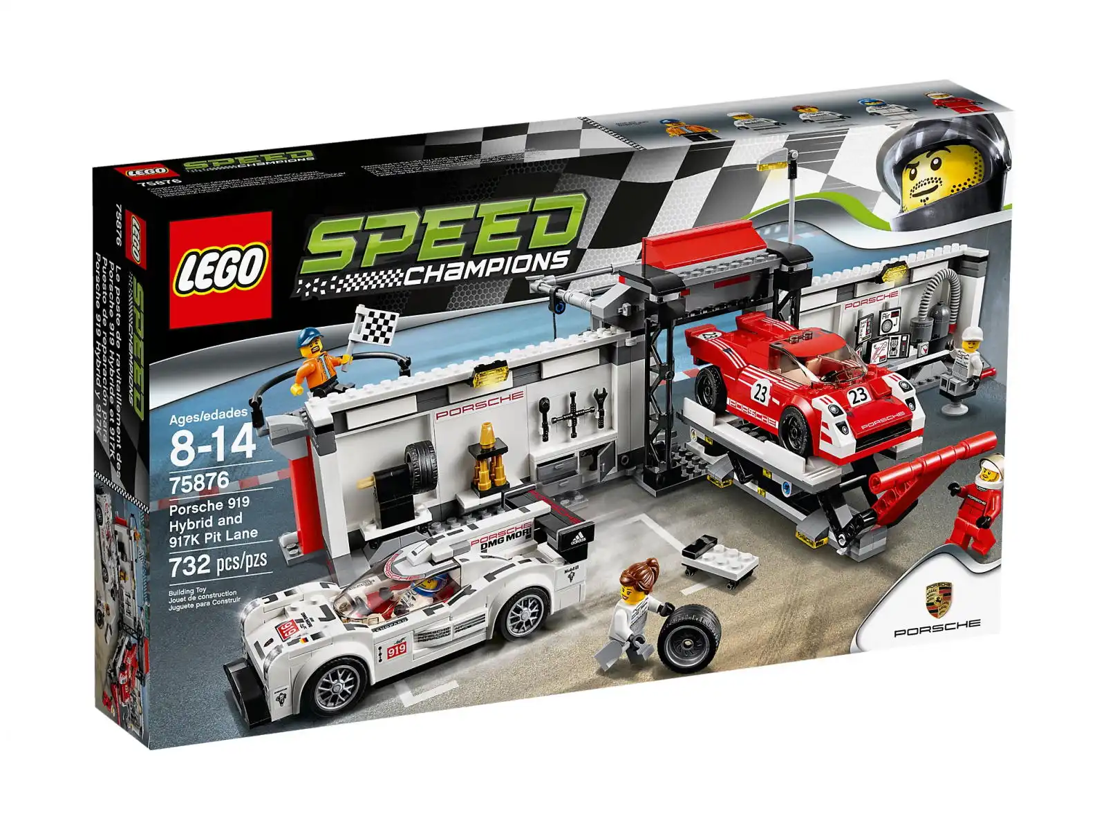 Odtwórz wyścig wraz z zespołem Porsche i pomóż nowoczesnemu modelowi 919 Hybrid zmierzyć się z oldtimerem Porsche 917K. Dwufunkcyjny garaż mieści podnośnik i narzędzia potrzebne, żeby przygotować maszyny do wyścigu. Po całkowitym rozłożeniu powstaje pit stop, gdzie możesz obserwować zmagania i śledzić, które auto jako pierwsze minie metę. W zestawie 5 minifigurek: kierowca wyścigowy starego Porsche, kierowca wyścigowy nowego Porsche, 2 mechaników i sędzia wyścigów.