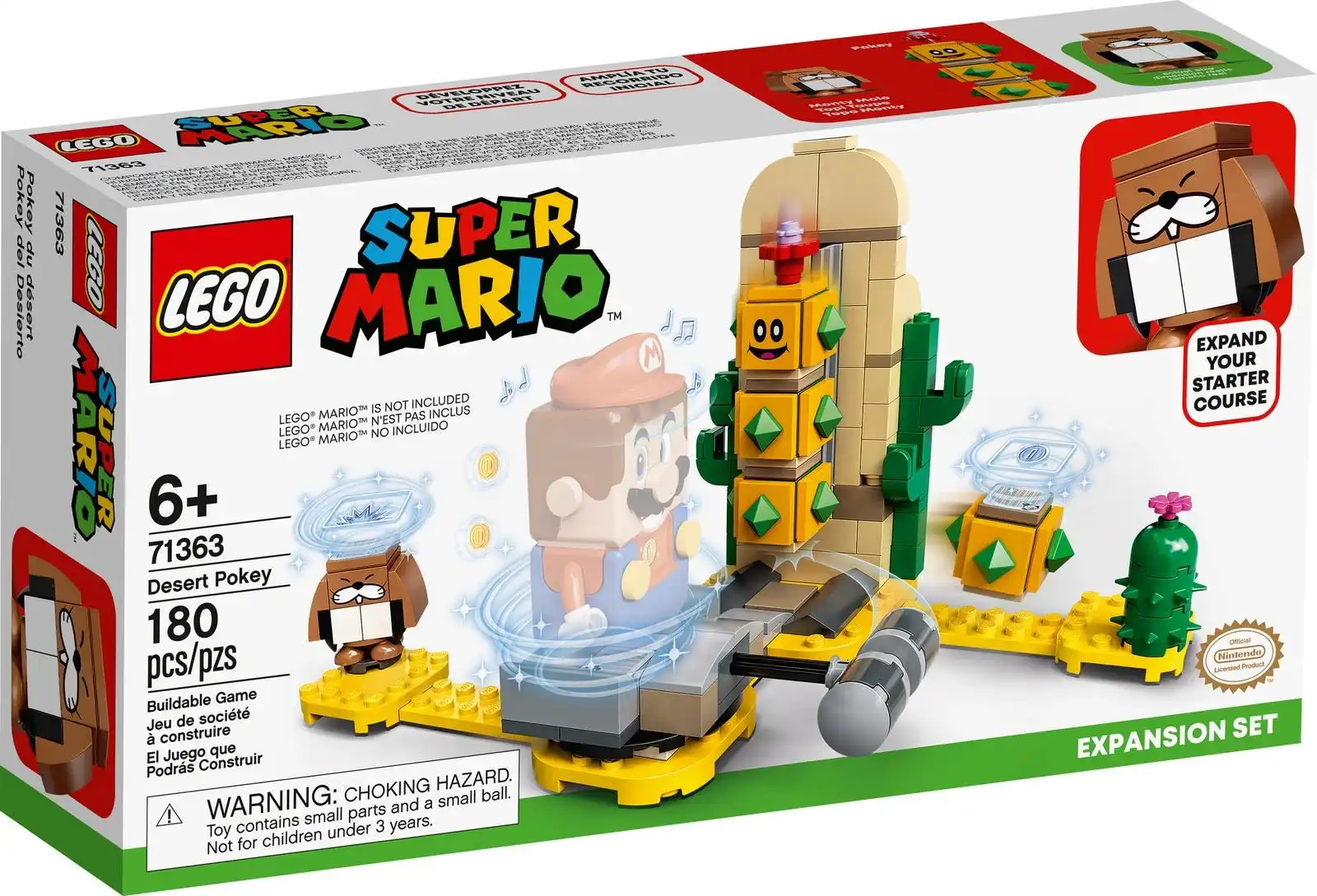 Zestaw dodatkowy Pustynny Pokey (71363) to fantastyczna gratka dla fanów, którzy mogą teraz uzupełnić Poziom startowy LEGO® Super Mario™ o nowe, emocjonujące wyzwanie z wymachiwaniem młotem! Jest tam pustynna scenka do zbudowania, obrotowa platforma z młotem dla LEGO Mario™, by mógł rozbić na kawałki swojego kaktusopodobnego wroga Pokeya, a także figurka Monty Mole’a do pokonania, za którego Mario dostanie wirtualne monety — słowem świetny prezent dla dzieciaków! (Uwaga: w komplecie nie ma figurki LEGO Mario; znajdziesz ją w zestawie 71360 Przygody z Mario — poziom startowy)