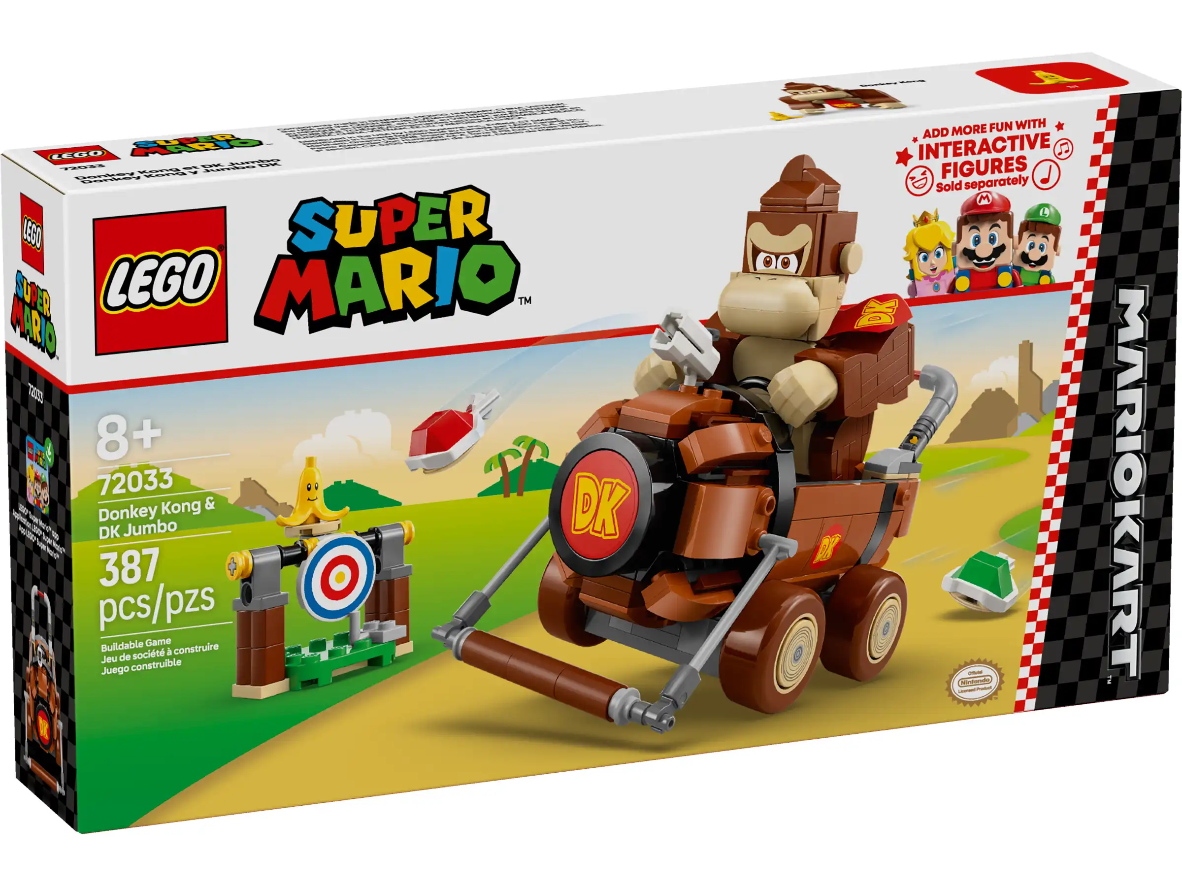 - Interaktywna, cyfrowa zabawa — prowadź DK Jumbo z figurką LEGO® Mario™, LEGO® Luigi™ lub LEGO® Peach™ (figurki nie są częścią zestawu), aby uruchomić efekty dźwiękowe i wizualne z gry Donkey Kong™ oraz Mario Kart™