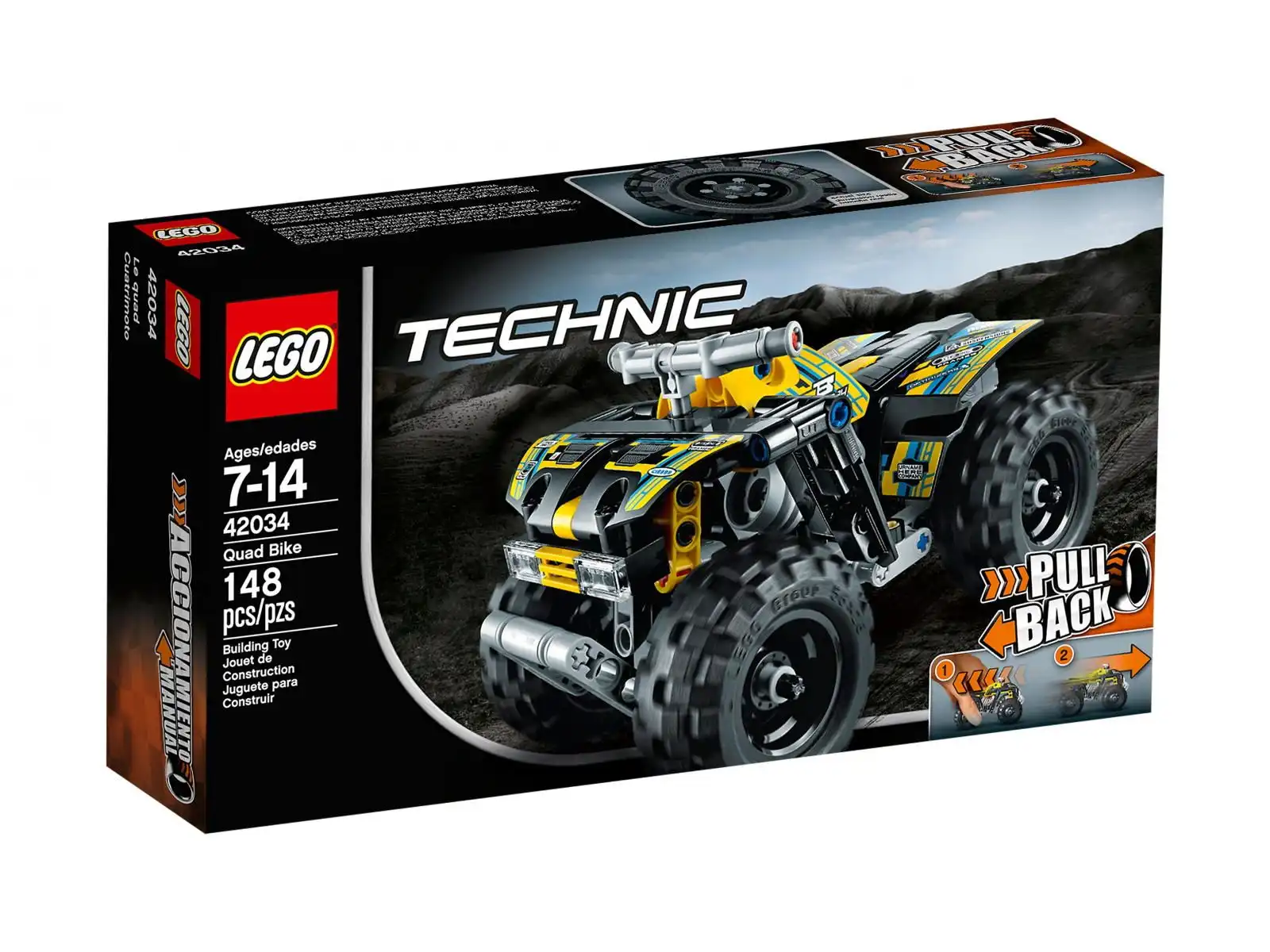 Pokonuj nawet najtrudniejszy teren dzięki wytrzymałemu quadowi LEGO® Technic! Ta solidna, potężna maszyna charakteryzuje się kolorystyką łączącą żółć, czerń, błękit i szarość i wyposażona jest w niezwykle efektowne kalkomanie, duże opony z głębokim bieżnikiem, wytrzymałe podwozie z wysoko umieszczonymi błotnikami, wciągarkę do pracy w najtrudniejszych warunkach oraz potężny napęd odciągowy pozwalający uzyskać duże prędkości. Przygotuj się na jazdę pełną mocnych wrażeń! Połączenie z zestawem 42033 Błyskawica pozwoli stworzyć niesamowicie szybki wyścigowy pojazd terenowy!