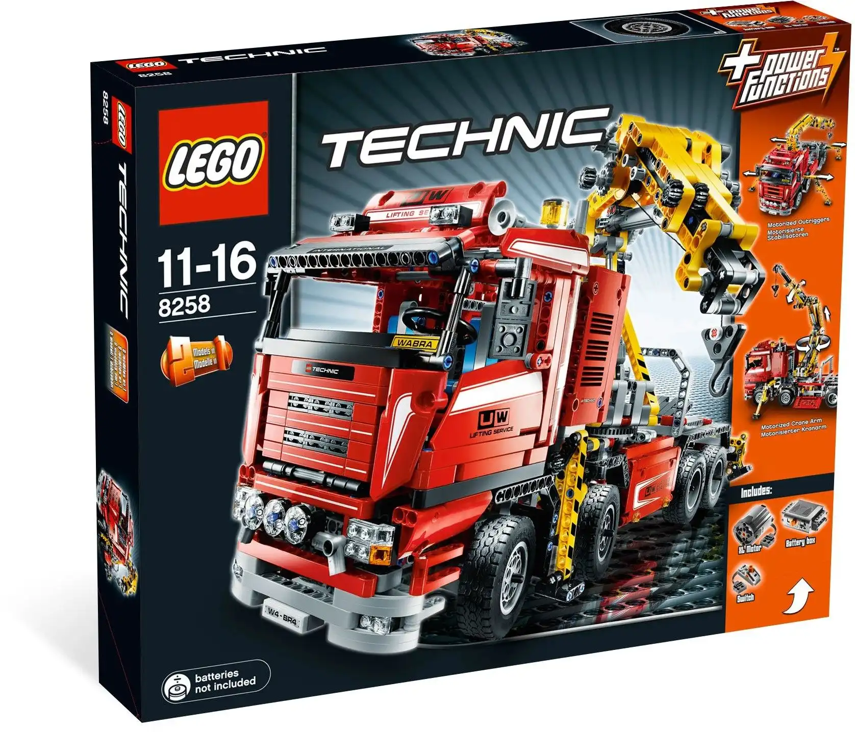Zestaw klocków LEGO Technic 8258 Crane Truck został przedstawiony w 2009 roku i składa się z 1877 klocków LEGO®. Klocki przeznaczone są dla dzieci i młodzieży powyżej 11 roku życia.