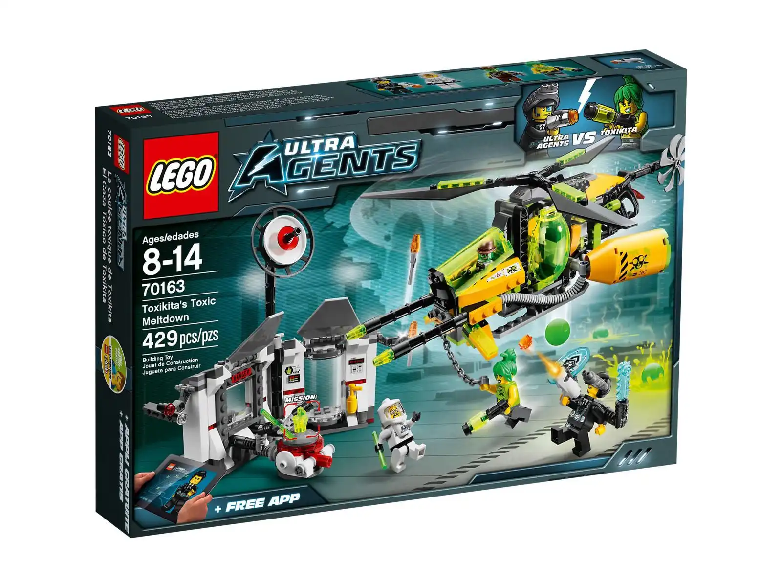 Ultra Agencie Curtisie Bolcie, mamy misję do wykonania! Zła Toxikita odkryła sekretne laboratorium na wyspie Pointer i zrzuca toksyczne bomby z helikoptera pilotowanego przez jej pachołka Retoksa. W laboratorium naukowiec z miasta Astor przeprowadza ważne eksperymenty przy użyciu zdalnie sterowanych zabezpieczonych pazurów. Ruszaj z pomocą i nie pozwól, by Toxikita ukradła kryształ i wykorzystała go jako źródło zasilania swojej superbroni — gdy ten element trafi w niepowołane ręce, konsekwencje będą straszne! Strzelaj z miotacza i odpalaj rakiety w stronę Toxikity, która po łańcuchu schodzi z helikoptera. Powstrzymaj ją, zanim zdąży uruchomić mechanizm wybuchu, który uwolni kryształ i doprowadzi do toksycznej zagłady miasta! W zestawie 4 minifigurki z wyborem broni i akcesoriami: Toxikita, Retox, agent Curtis Bolt i naukowiec z miasta Astor.Opakowanie nosi delikatne ślady otarć .