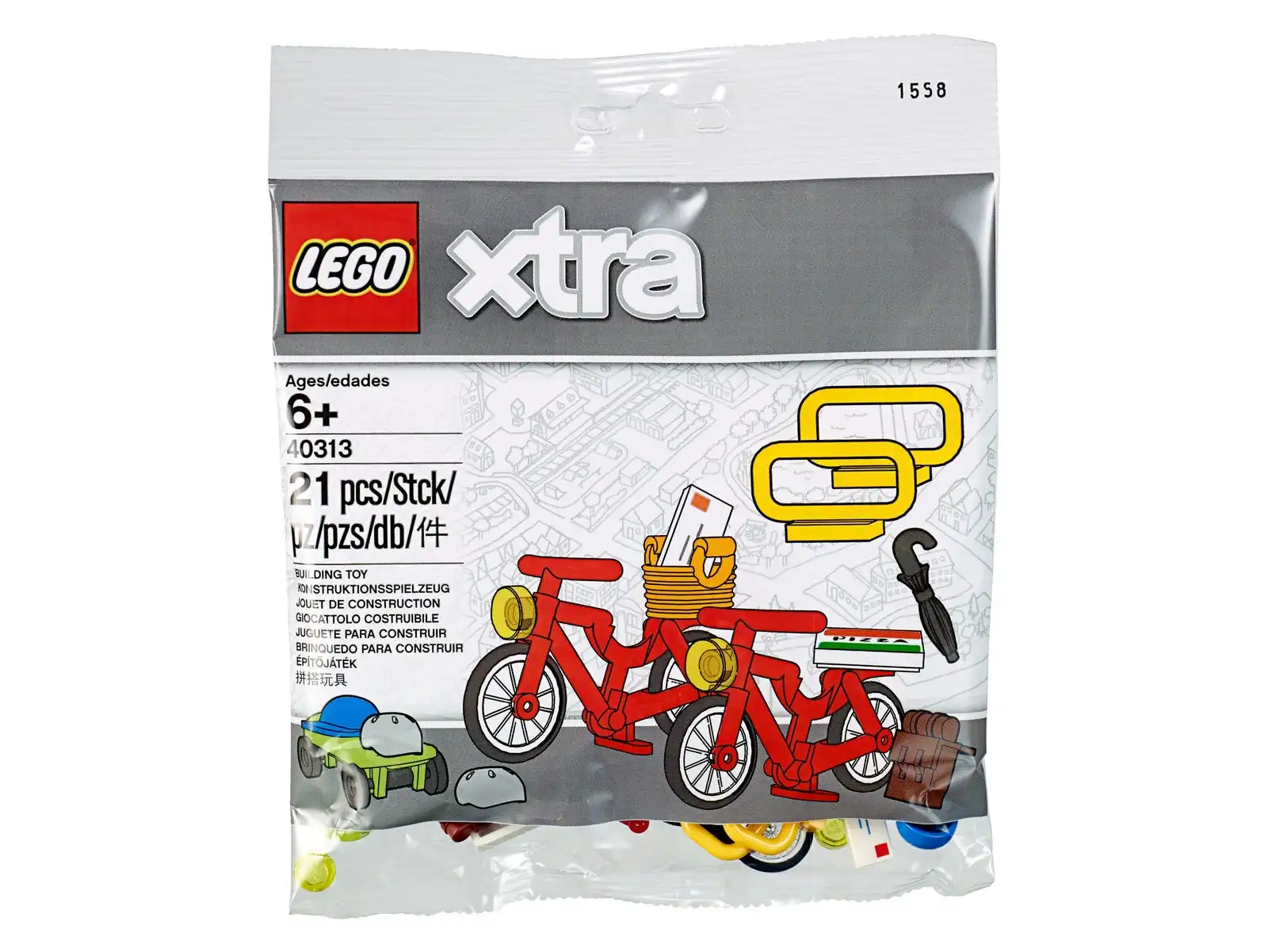 Masz ochotę pośmigać na dwóch kółkach? Załóż kask i sięgnij po zestaw 40313 Rowery z serii LEGO® xtra! Znajdziesz w nim 2 rowery z lampami i podpórkami, deskorolkę, 2 kaski rowerowe, czapeczkę, list, pudełko na pizzę, parasol, plecak i 2 stojaki rowerowe. Te dodatkowe akcesoria w połączeniu z każdym zestawem LEGO dadzą dzieciom nowe, nieograniczone możliwości zabawy.